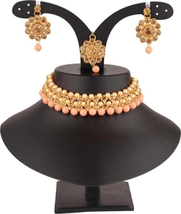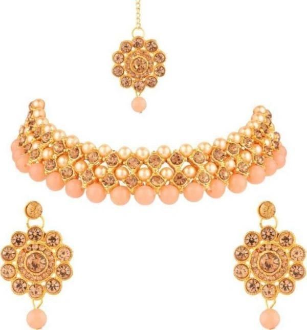 Rhosyn Women And Girls Gold Plated Alloy Necklace, Earring And Maang Tikka Set