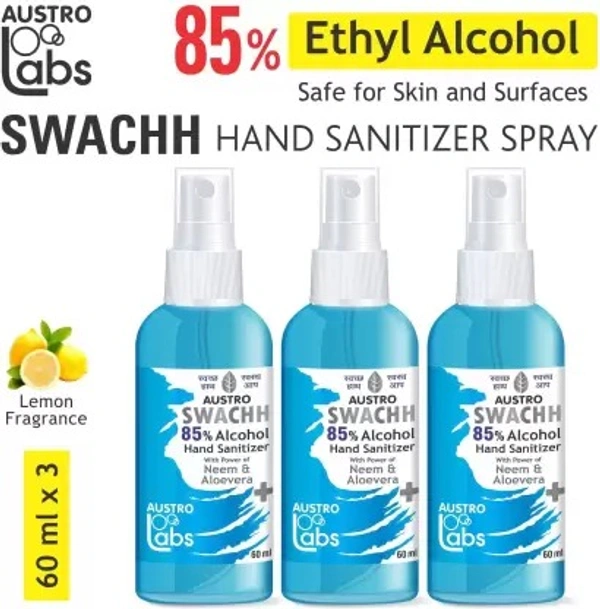 Brand Is Austro Labs. Type Is Sanitizer Spray. Model Name Is Swachh Hand Sanitizer Spray 3 * 60 Ml, Ethyl Alcohol 85%. Maximum Shelf Life Is 36 Months. Containe