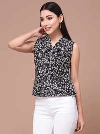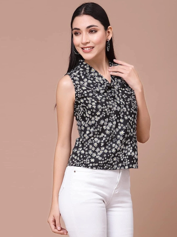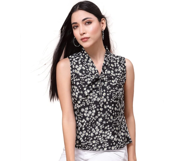 OOMPH! Women's Crepe Printed top with Tie Neck and Sleeveless