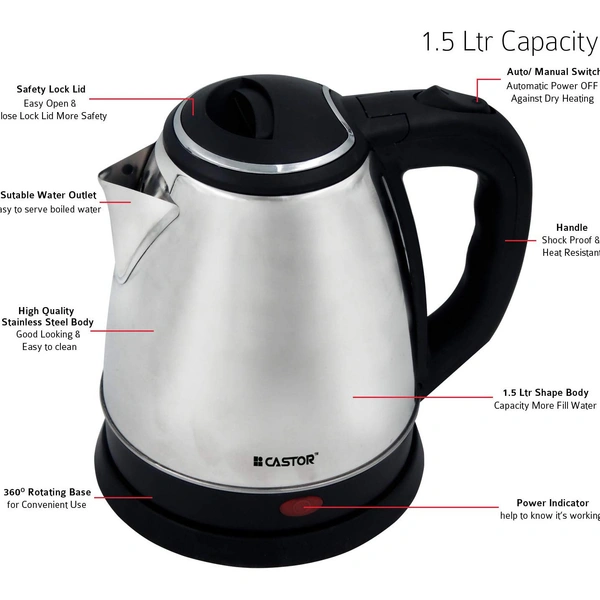 iBELL Castor CTEK15L Premium 1.5 Litre Stainless Steel Electric Kettle,1500W Auto Cut-Off Feature,Silver