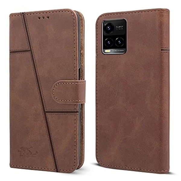 Jkobi Flip Cover Case for Vivo Y21 2021 (Stitched Leather Finish | Magnetic Closure | Inner TPU | Foldable Stand | Wallet Card Slots | Brown)