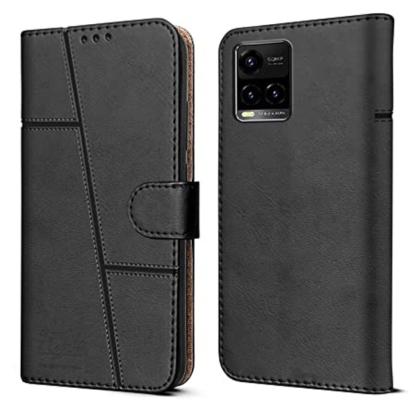 Jkobi Flip Cover Case for Vivo Y21e | Vivo Y21A | Vivo Y32 (Stitched Leather Finish | Magnetic Closure | Inner TPU | Foldable Stand | Wallet Card Slots | Black)