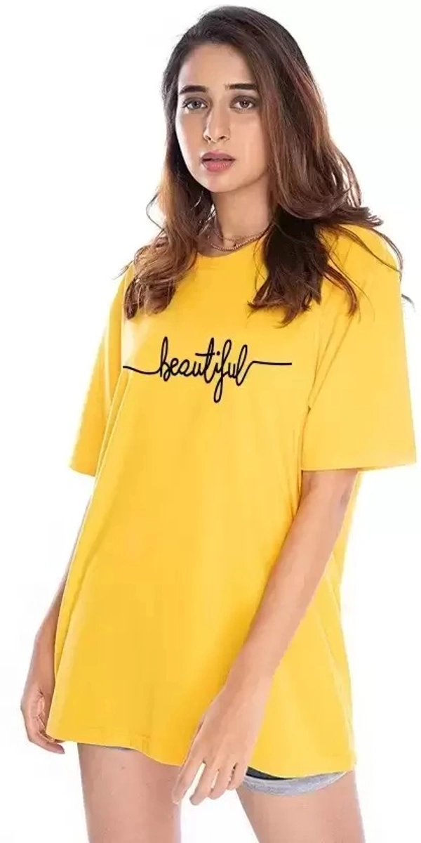 Women Typography Round Neck Cotton Blend Yellow T-Shirt