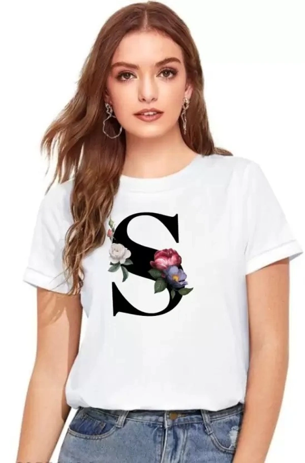 Women Flower Letters S Women Graphic Print Round Neck Polyester White T-Shirt